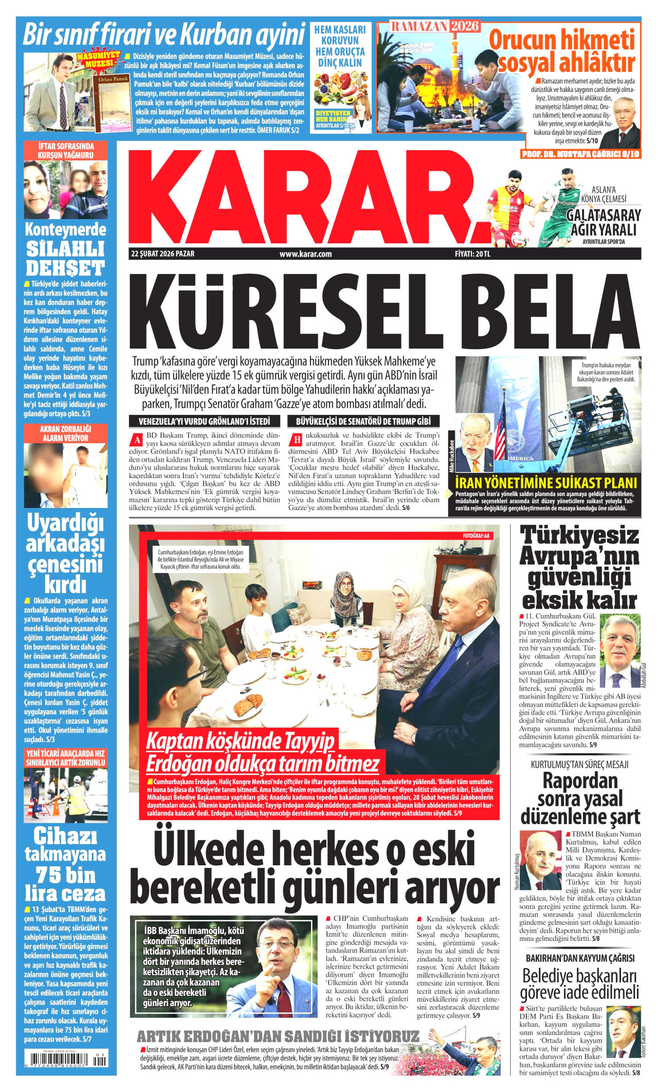 KARAR Gazetesi 22 Şubat 2026, Pazar Günü Manşeti