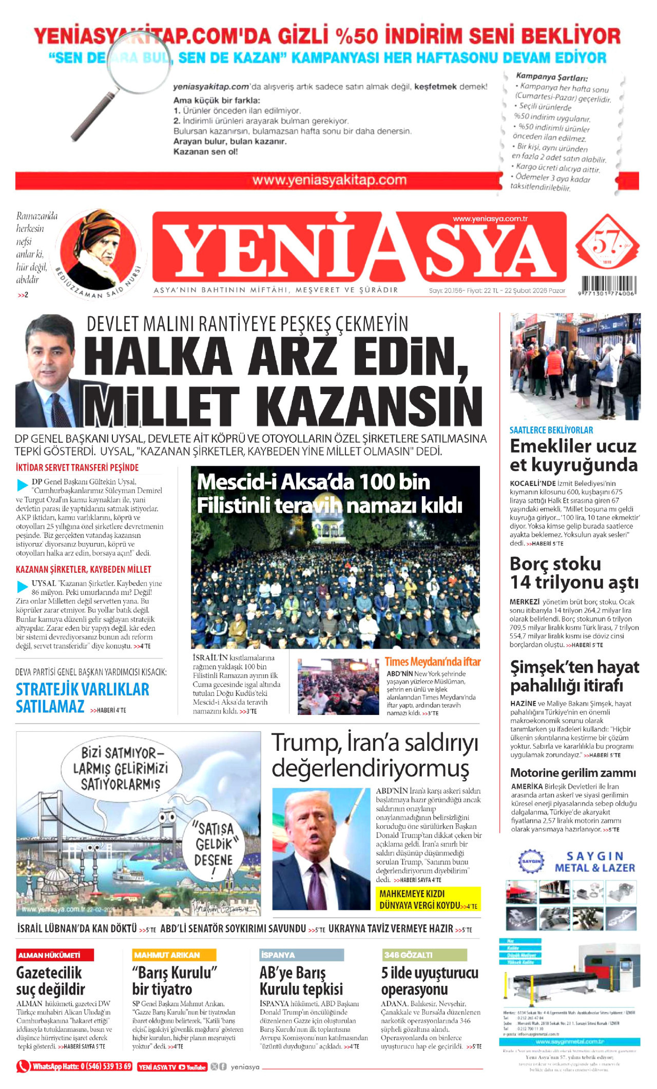 YENİ ASYA Gazetesi 22 Şubat 2026, Pazar Günü Manşeti